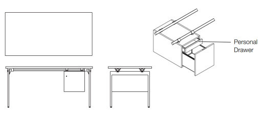 • Personal storage drawer with independent slides accessible behind file drawer front (see dimensions)