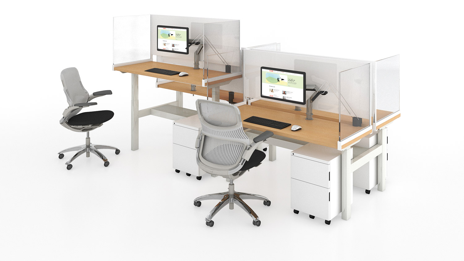 End and Intermediate Screens plan at the end of a desk or are shared between adjacent users to delineate individual workspaces. End Screens feature a bracket that clamps to the front and back edges of the top for easy removal or reconfiguration.