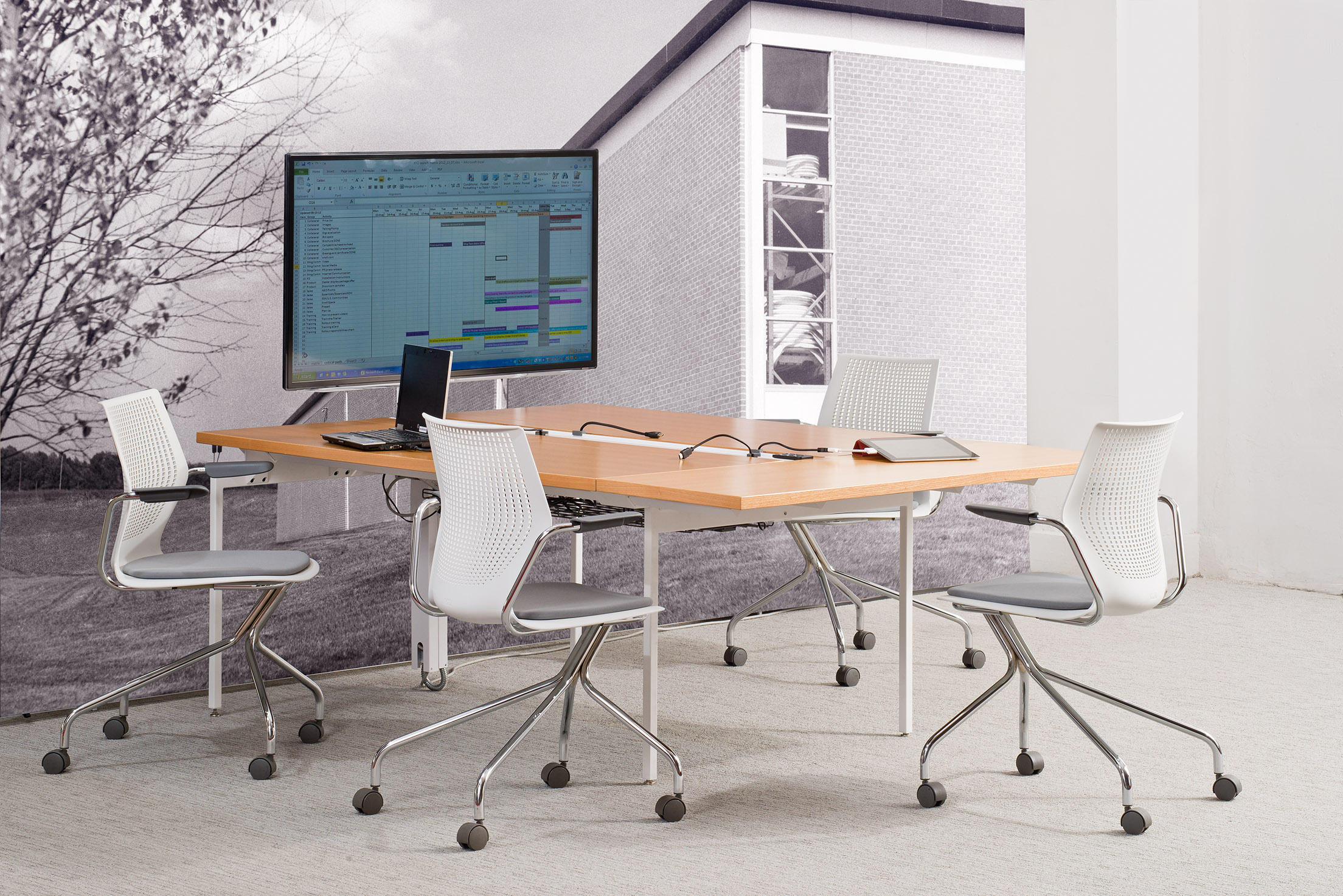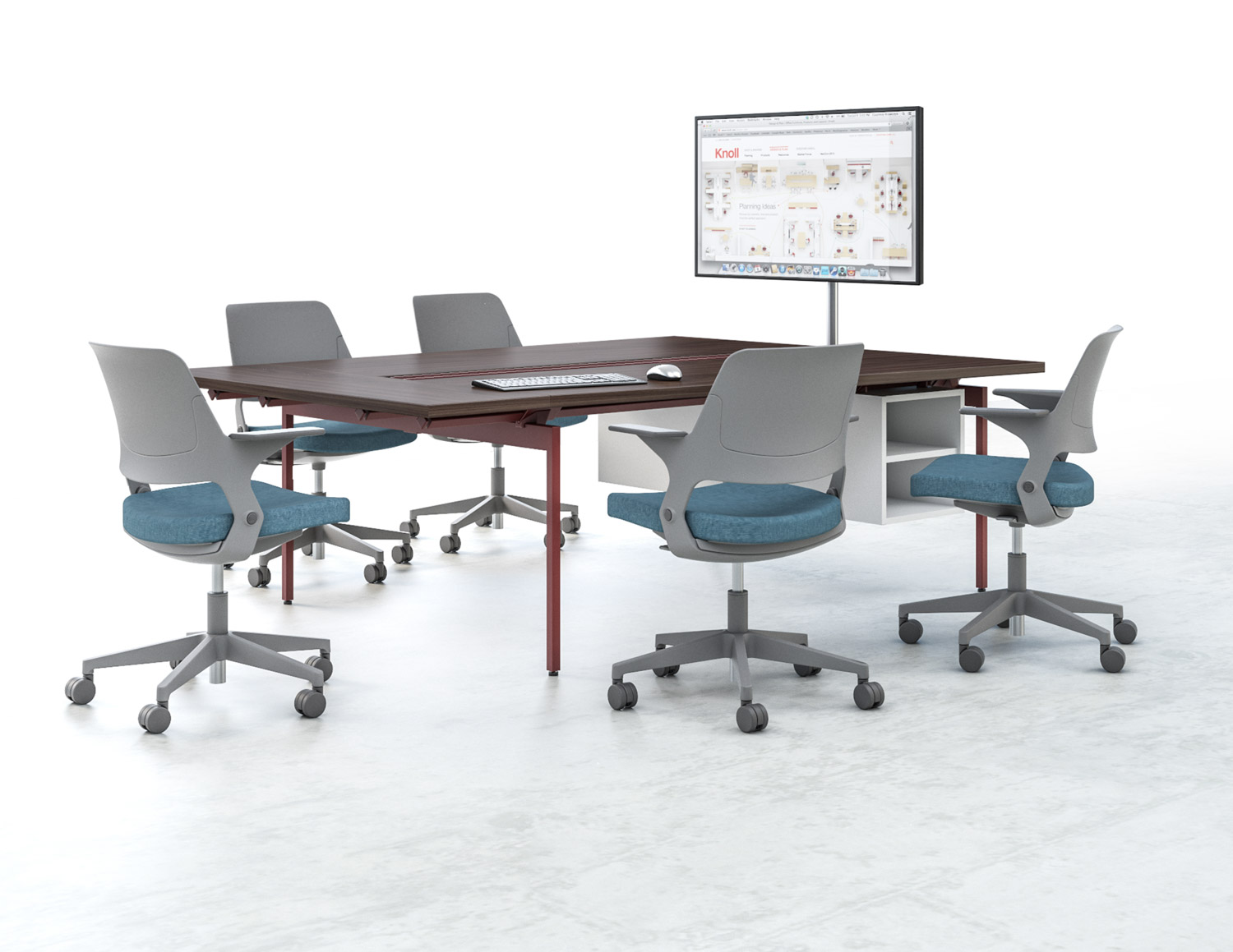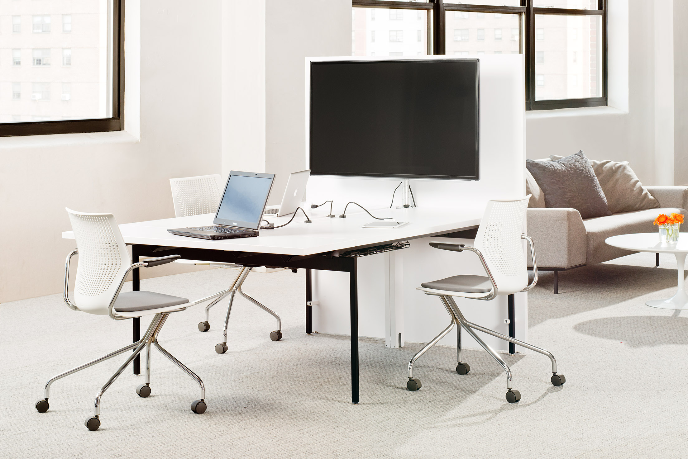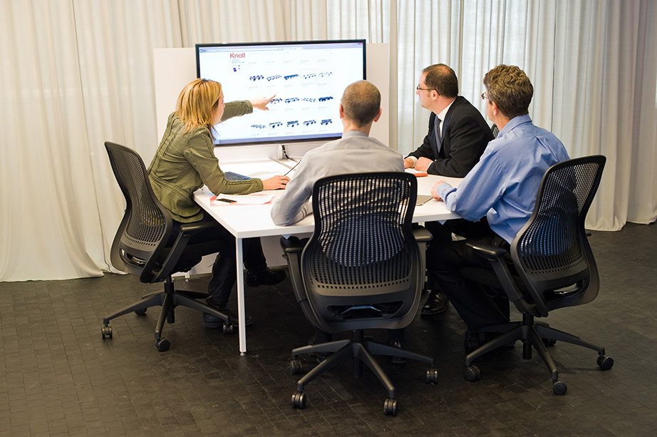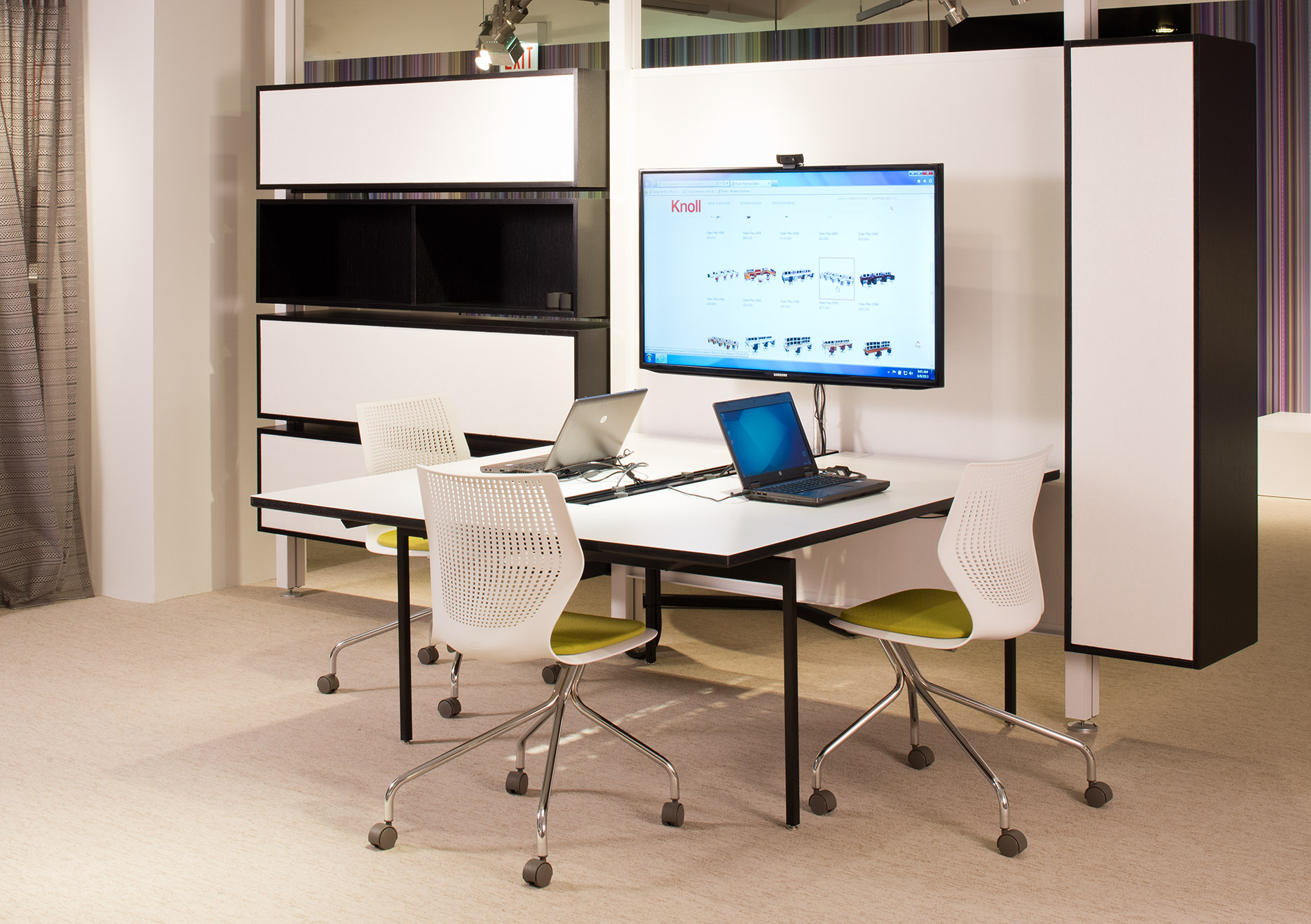 The Antenna Workspaces Media Enclave is a collaborative activity space for small group meetings of two to six participants using a TV or shared screen. Recognizing that technology has a life cycle of 18 to 24 months while furniture lasts much longer, Media Enclave is designed to engage with technology, rather than embed technology.