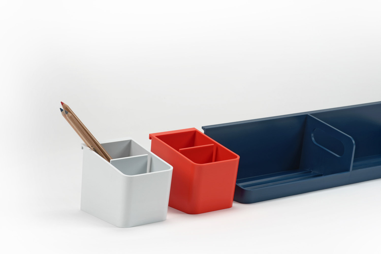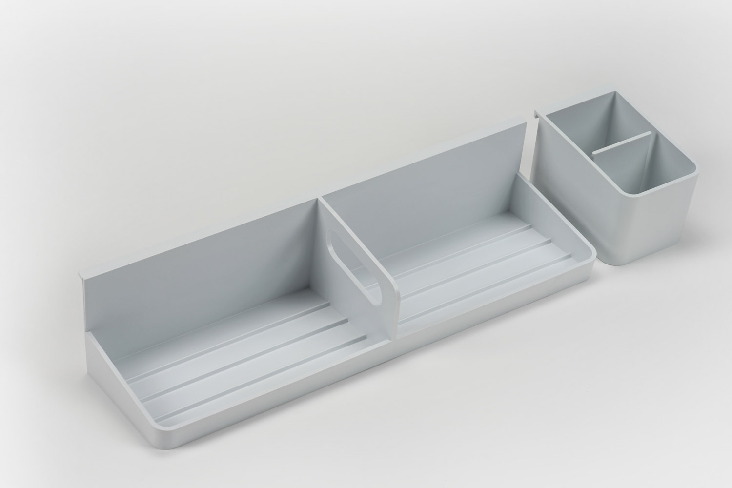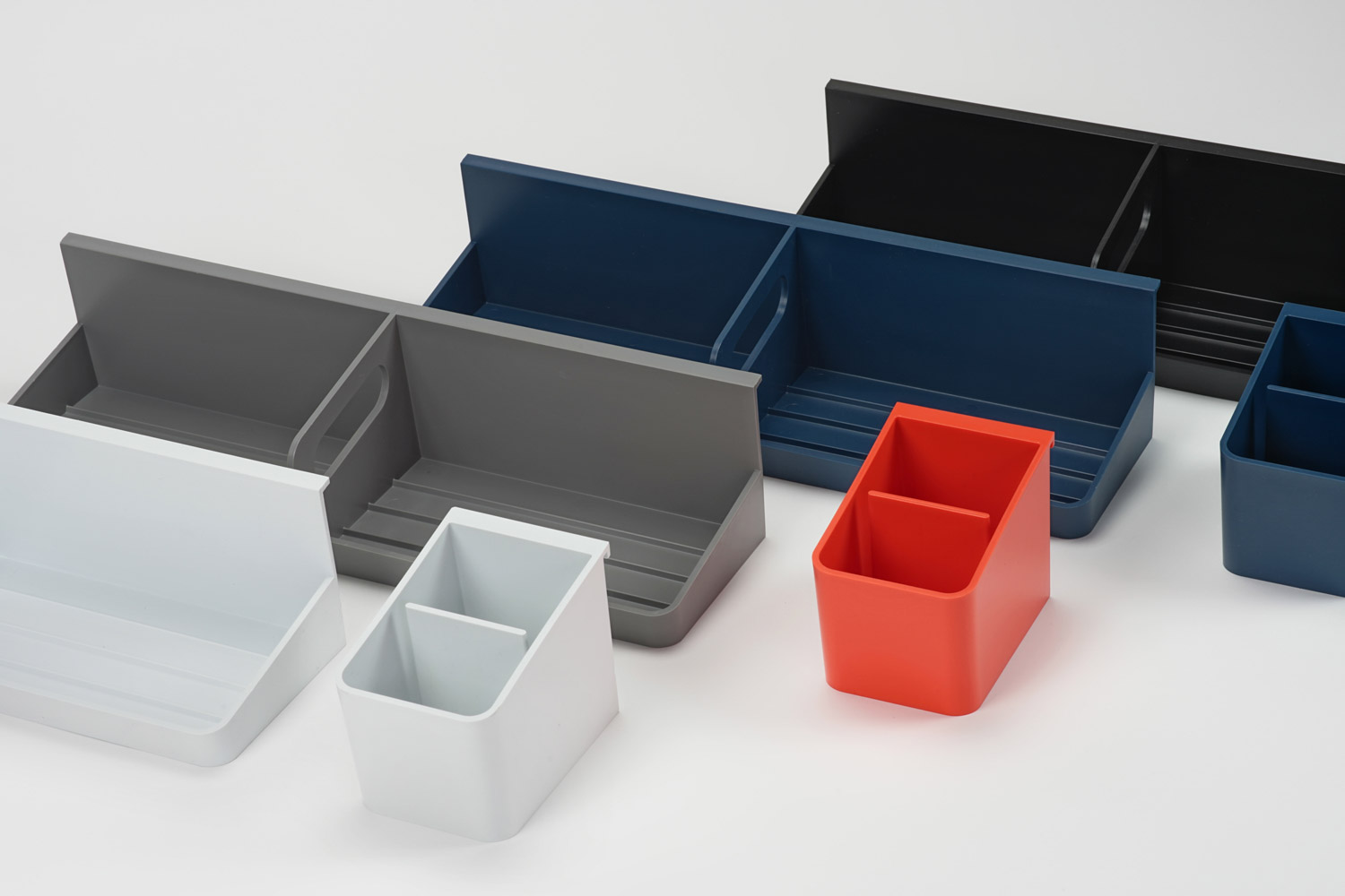 The Antenna ladder screen's simple, people-centered design delineates space and supports various combinations of accessories, while allowing light to filter into the workstation. Thoughtful details, like the forward lean of the cup and tray which orient tools towards the user, and the tray’s integrated handle for taking supplies on the go, support comfort, productivity, and flexibility in the workplace.
