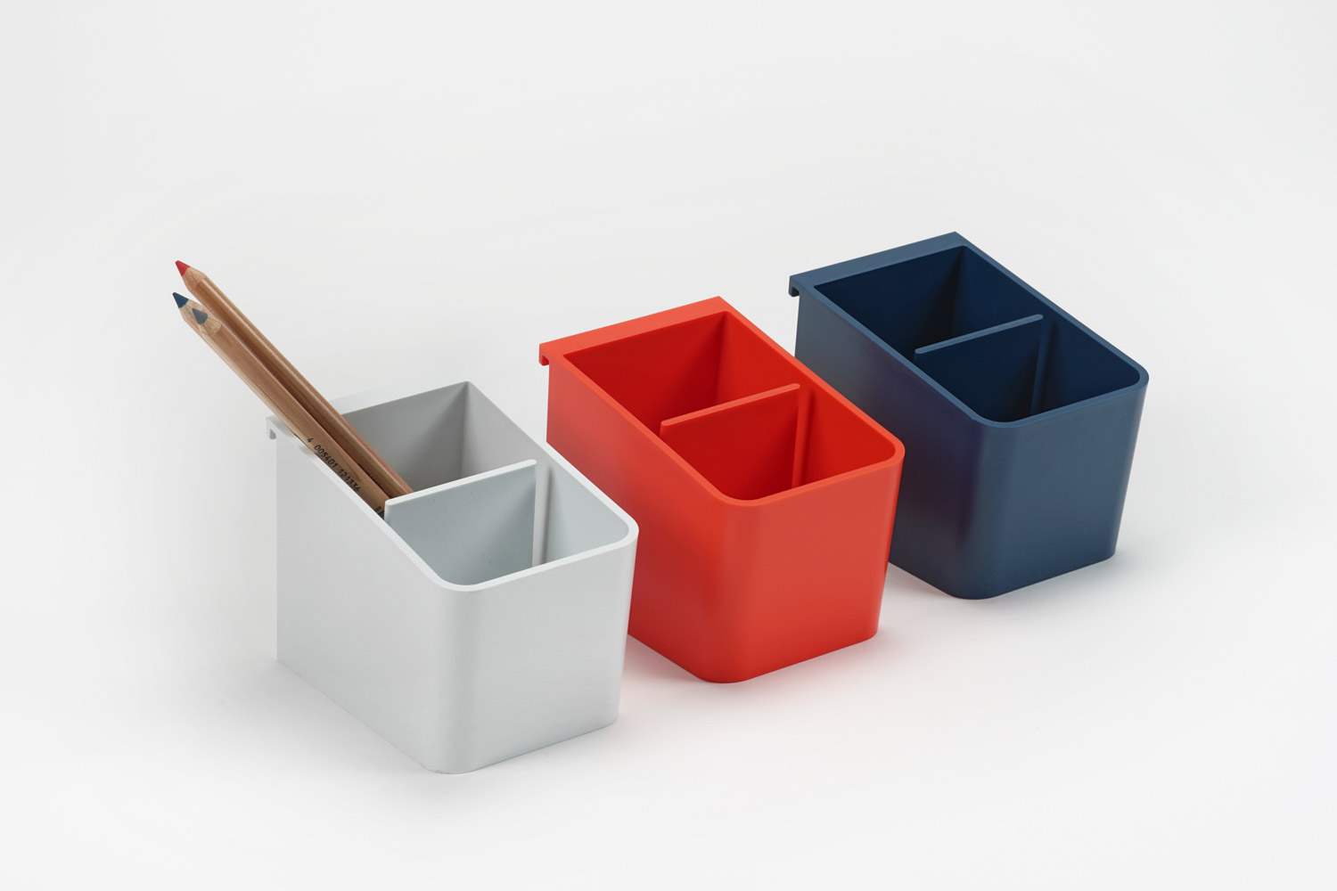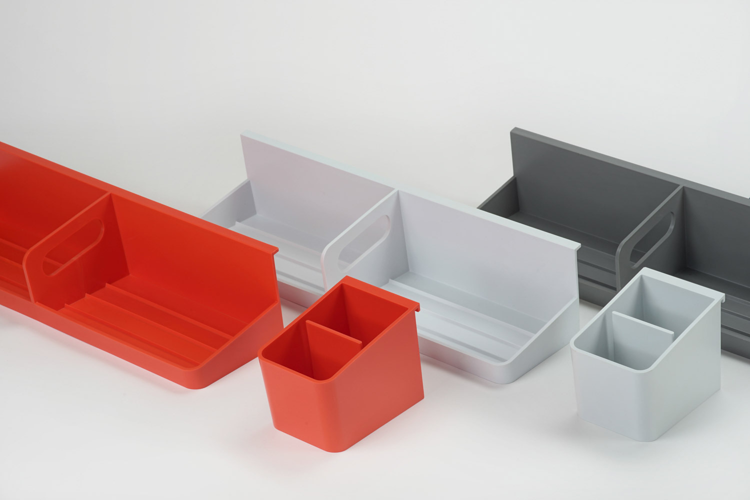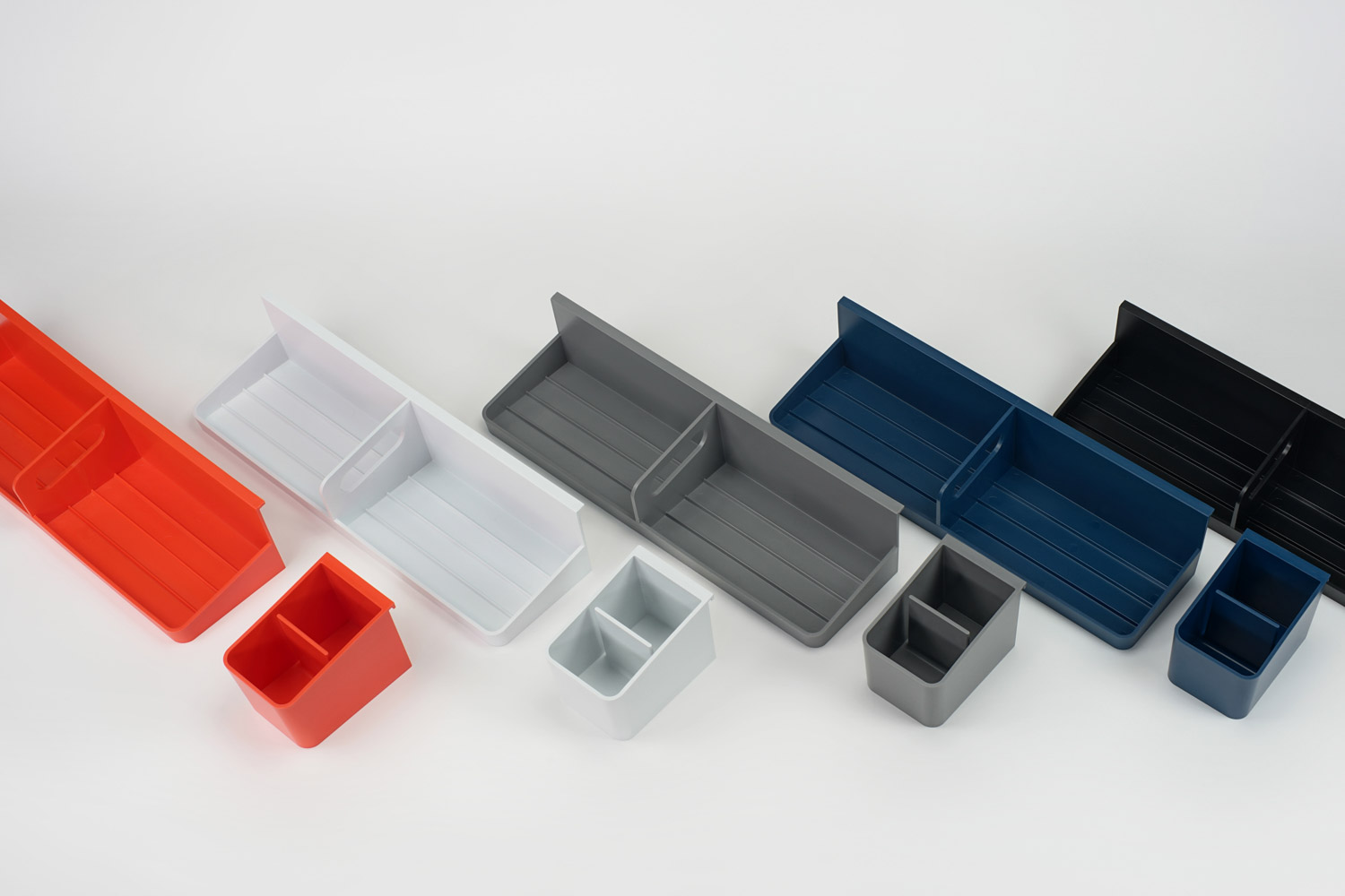 The Antenna ladder screen's simple, people-centered design delineates space and supports various combinations of accessories, while allowing light to filter into the workstation. Thoughtful details, like the forward lean of the cup and tray which orient tools towards the user, and the tray’s integrated handle for taking supplies on the go, support comfort, productivity, and flexibility in the workplace.