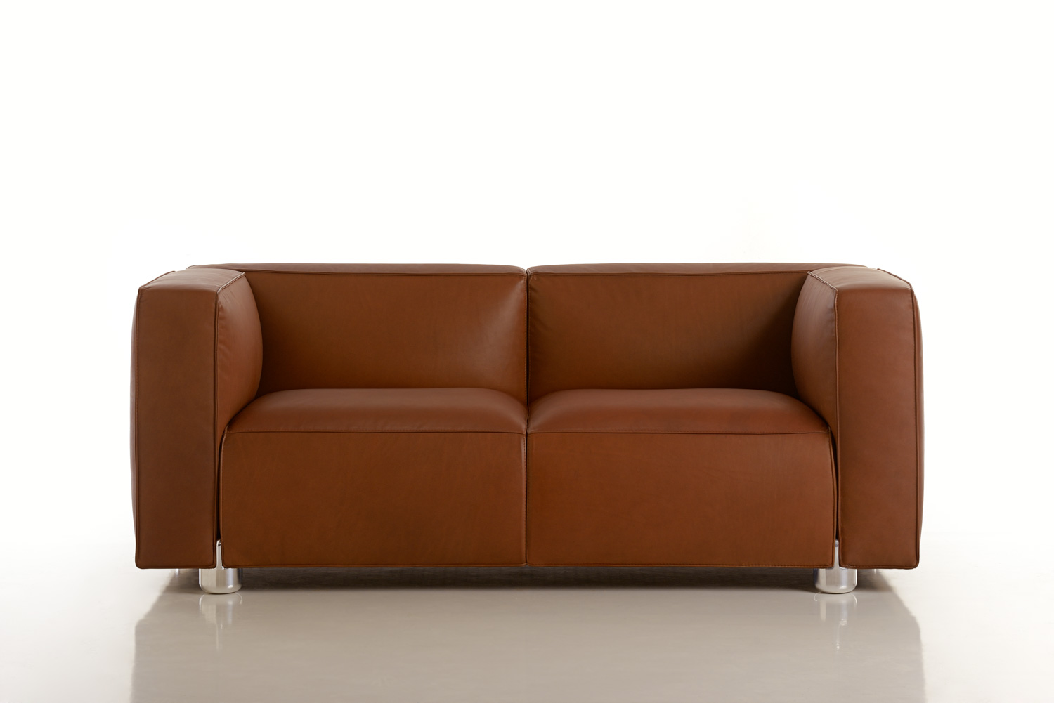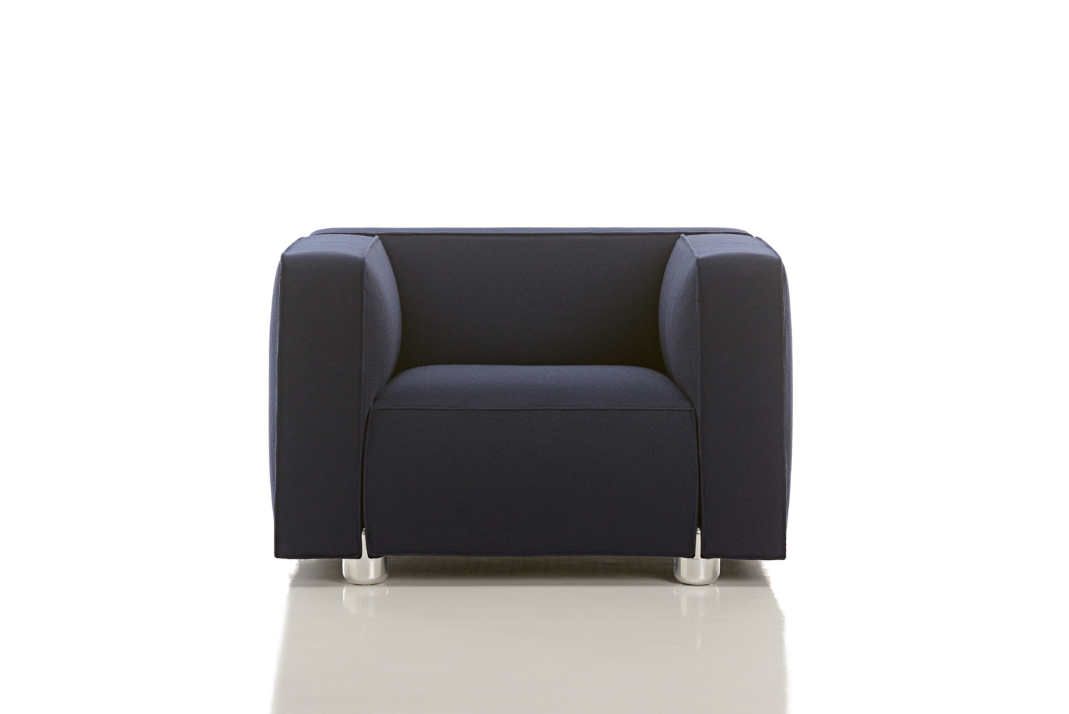 The Compact Lounge Chair are Sofa are scaled for the workplace, with a lower back and reduced seat depth. Stitched seams distinguish the pieces and reinforce their architectural profile, which is softened by the curvature of cushions on each face. The signature cast aluminum leg of the furniture can be specified in chrome and painted finishes.