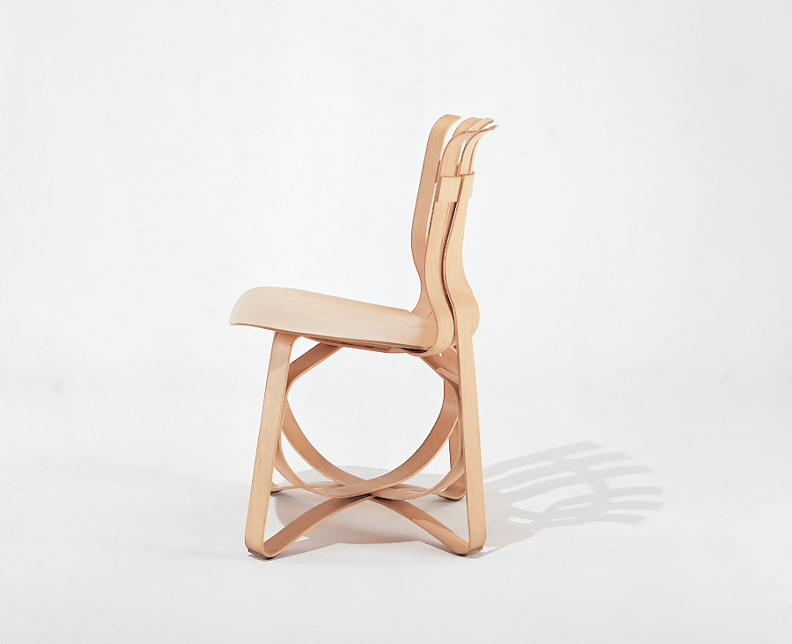 Inspired by the surprising strength of the apple crates he had played on as a child, Frank Gehry created this thoroughly original collection of bentwood chair and table designs. Gehry’s architecture draws its strength from the sculptural approach with which he has expanded the vocabulary of buildings. Bringing this same approach to furniture, Gehry constructed the entire collection with interwoven strips of maple. The ribbon-like designs transcend the conventions of style by focusing, as the great modernists did, on the essential challenge of deriving form from function.