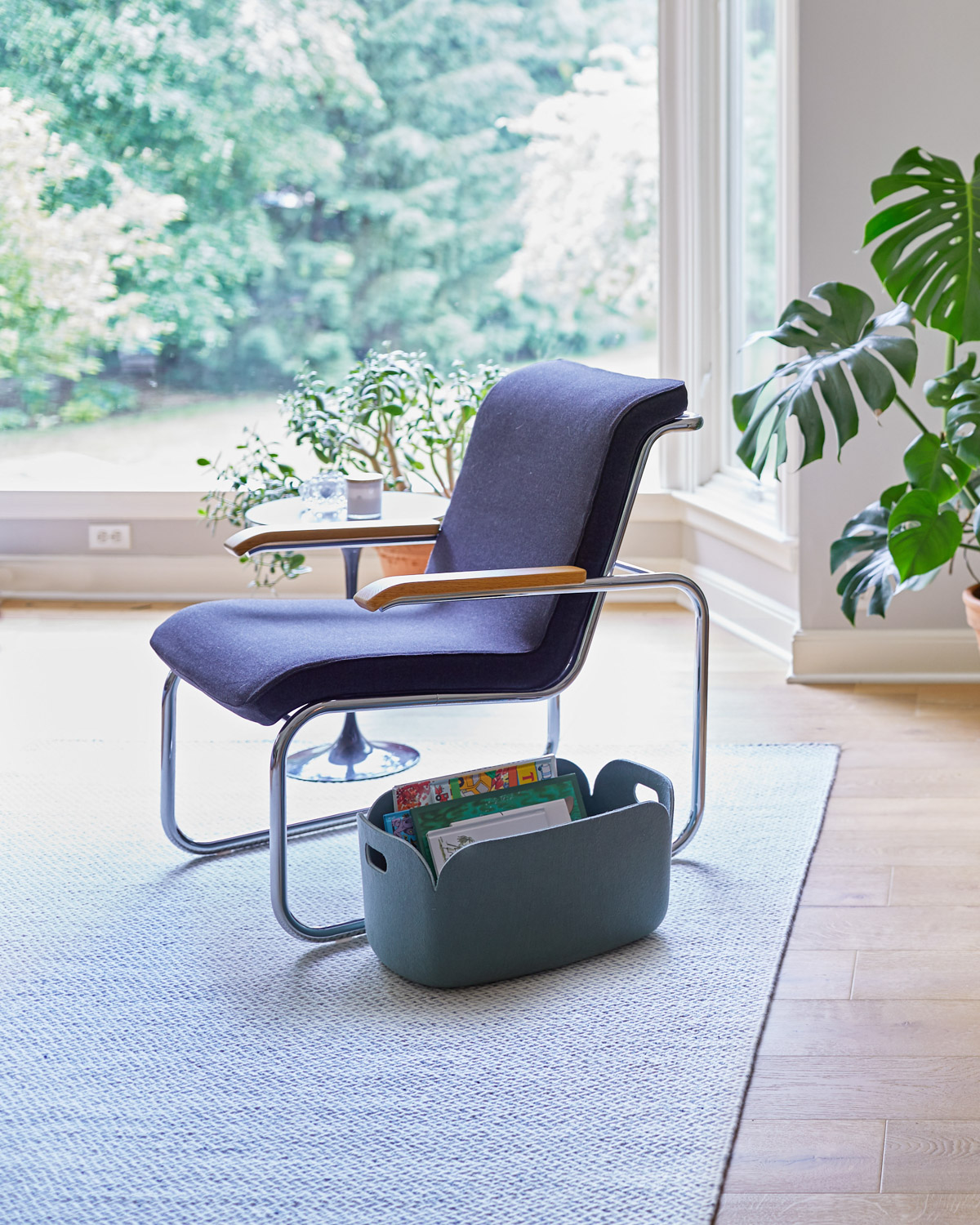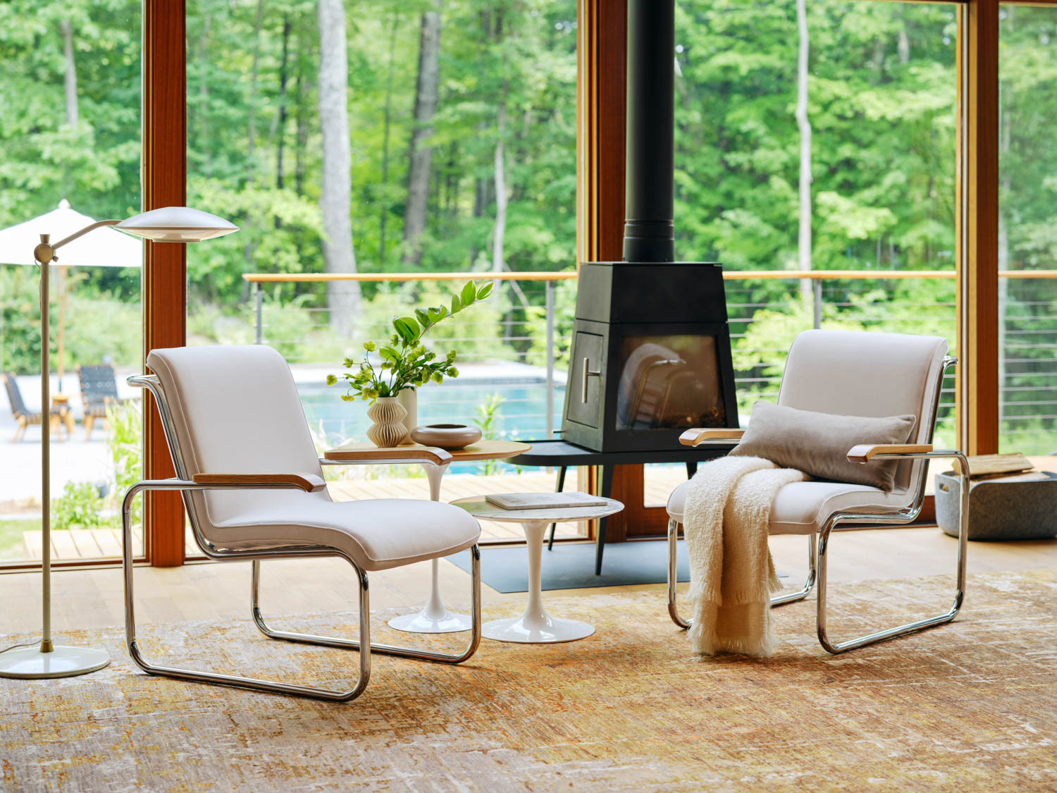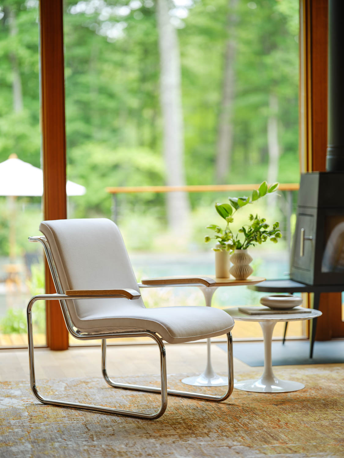Marcel Breuer 1929 MB Lounge is part of the architect’s extensive work using tubular steel, a revolutionary material in furniture construction at the time. In a contrast to the Wassily Chair—one of Breuer’s best-known designs from the Bauhaus—the MB Lounge features a seemingly continuous, freefloating frame, simultaneously reflecting a tensile strength and straightforward elegance. The chair combines an upholstered foam cushion supported by horizontal metal springs that provide slight movement to the back, along with natural oak armrests that have a clear lacquer finish.