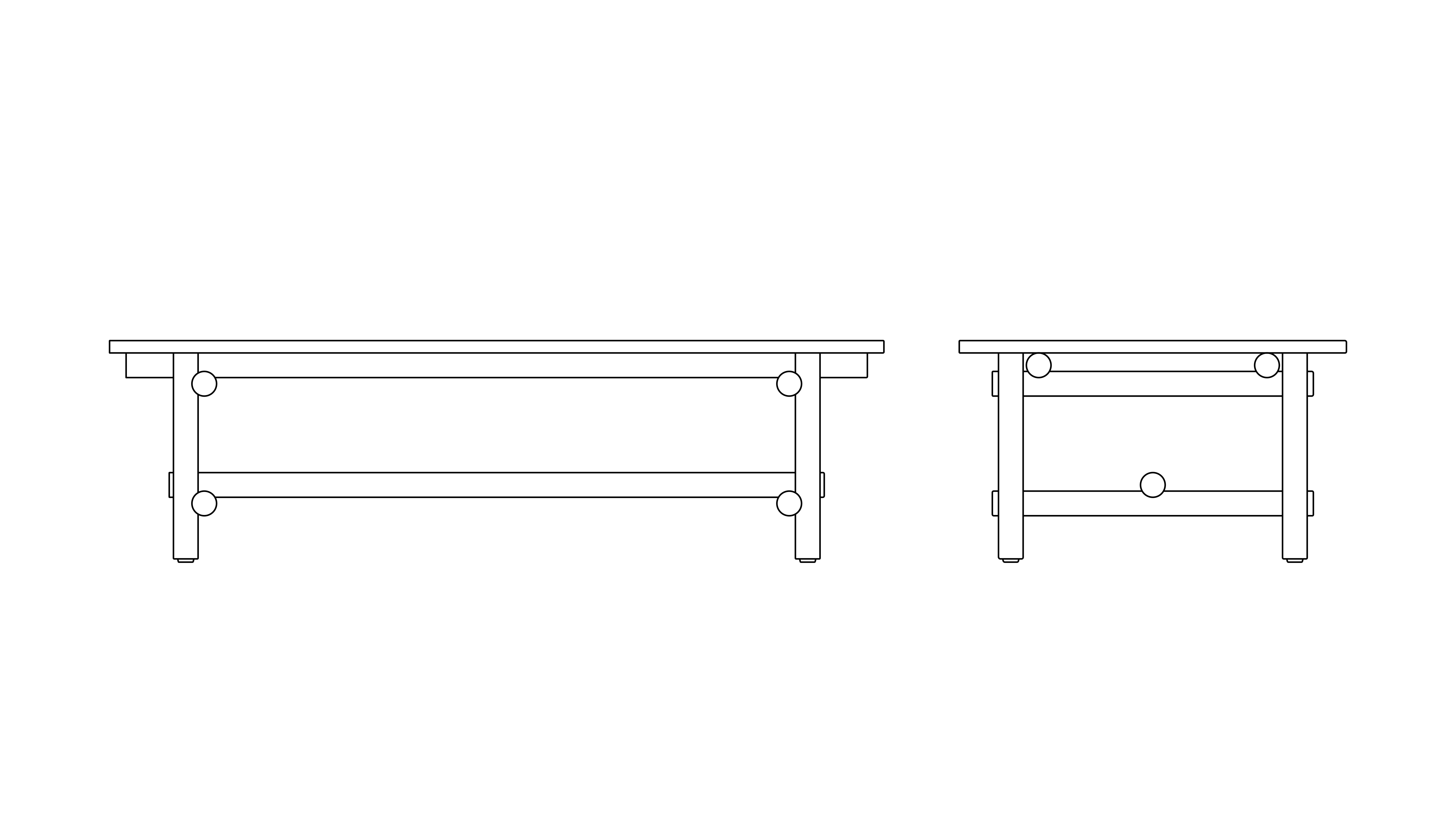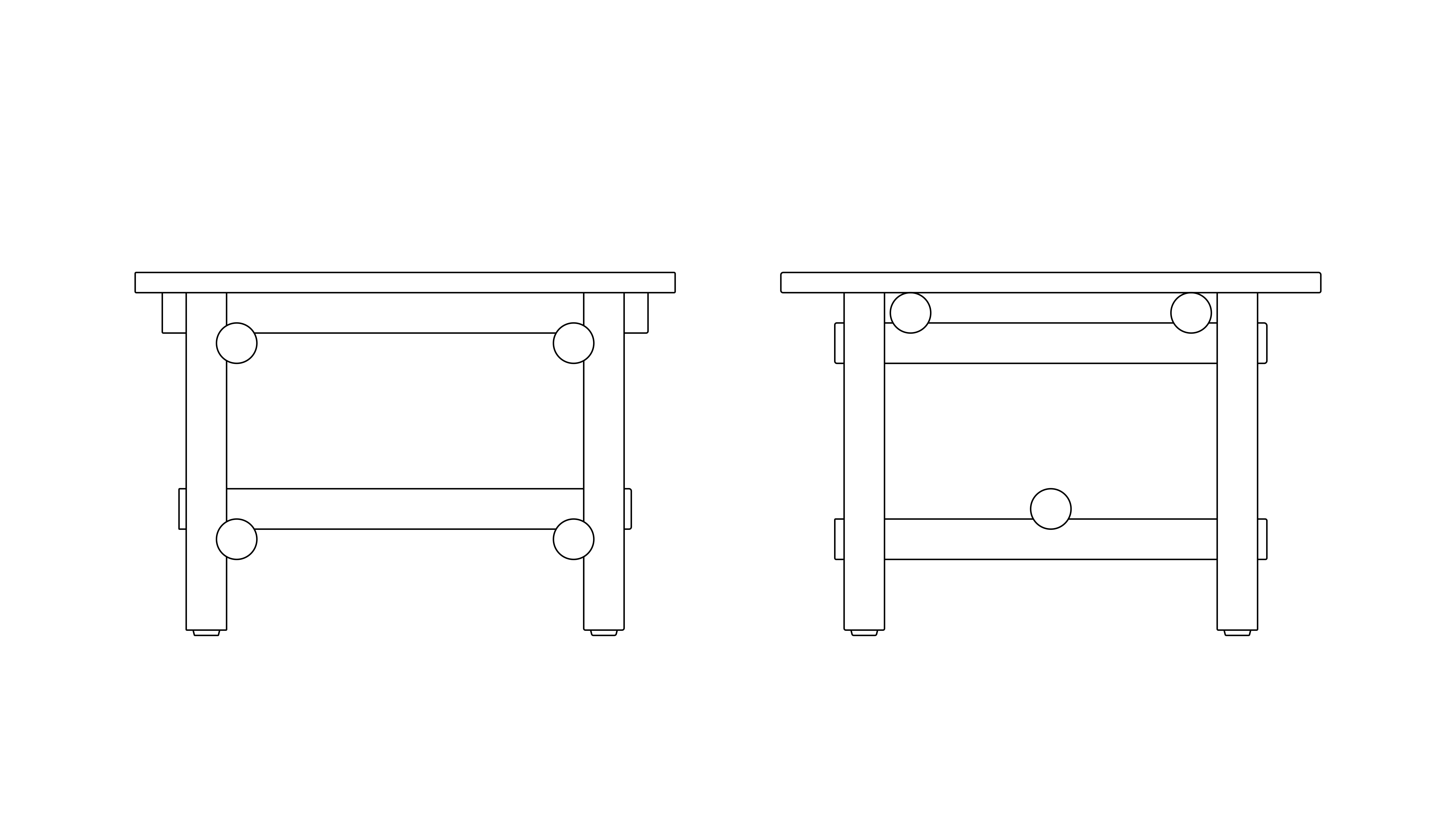 Muecke developed a distinct joinery system that repeats throughout the collection. Rounded dowels pass on adjacent planes, connected where they meet by a floating tenon.
