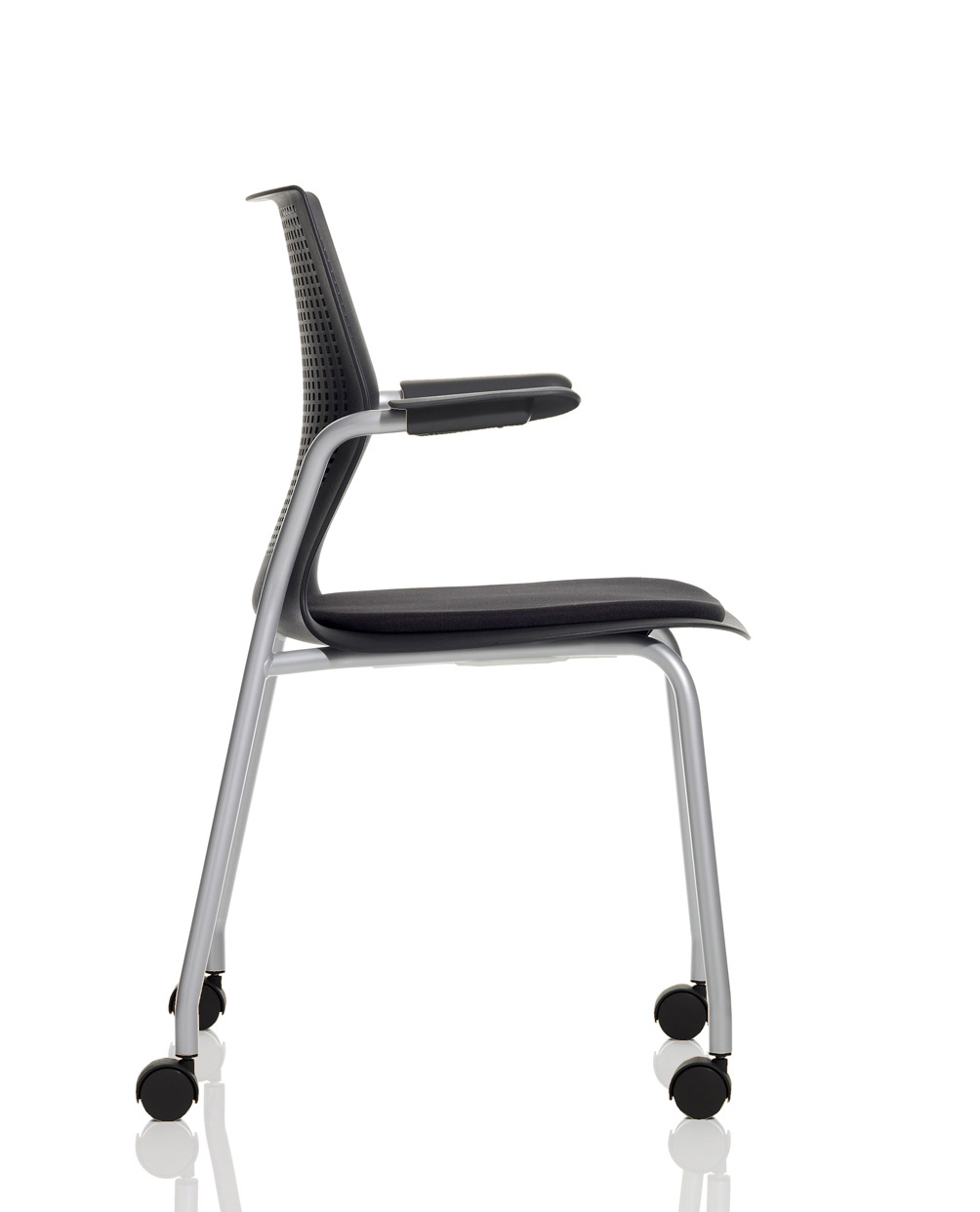 The full, curved back allows for upper body movement and supports the lower back for upright, interactive postures, while a gently contoured seat with rounded corners and a cantilevered arm design lets you shift positions easily. The arms feature contoured arm pads to lean against when side sitting.