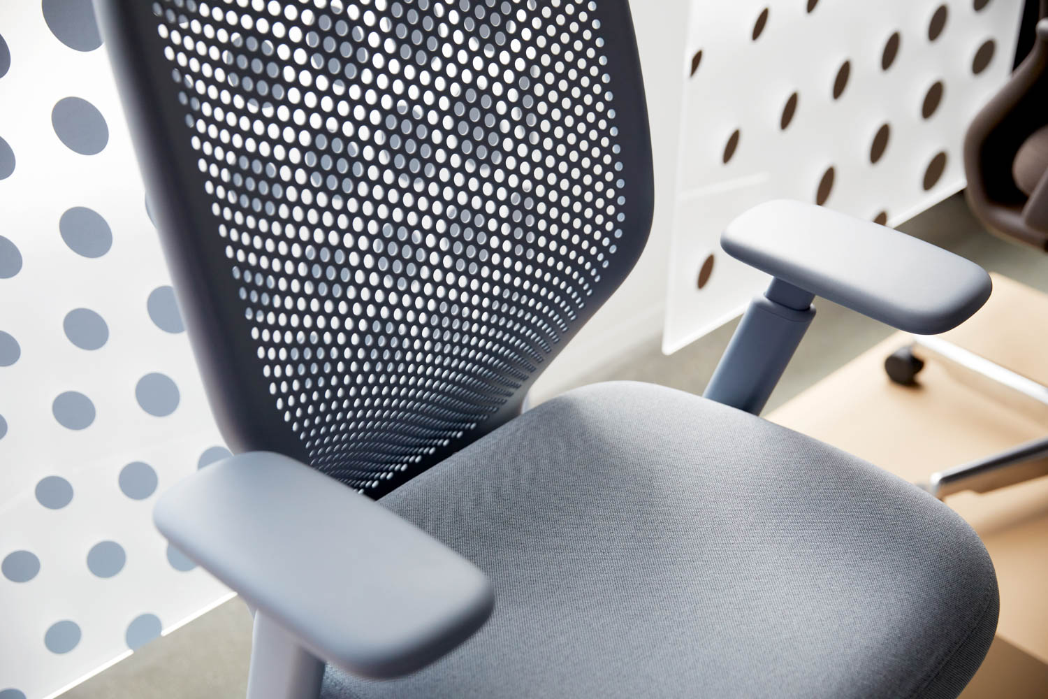 This chair provides a sensory experience with refined textures on every surface. The back and arm feel soft like suede, and the contrasting knobs and handles draw your attention for adjusting.