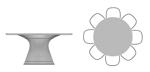 In 1966, the Platner Collection captured the “decorative, gentle, graceful” shapes that were beginning to infiltrate the modern vocabulary. The iconic pieces are created by welding hundreds of curved steel rods to circular frames, simultaneously serving as structure and ornament.