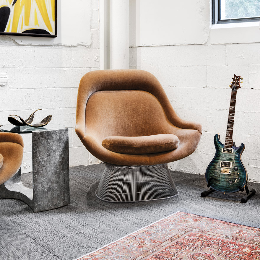 In 1966, the Platner Collection captured the “decorative, gentle, graceful” shapes that were beginning to infiltrate the modern vocabulary. The iconic pieces are created by welding hundreds of curved steel rods to circular frames, simultaneously serving as structure and ornament.