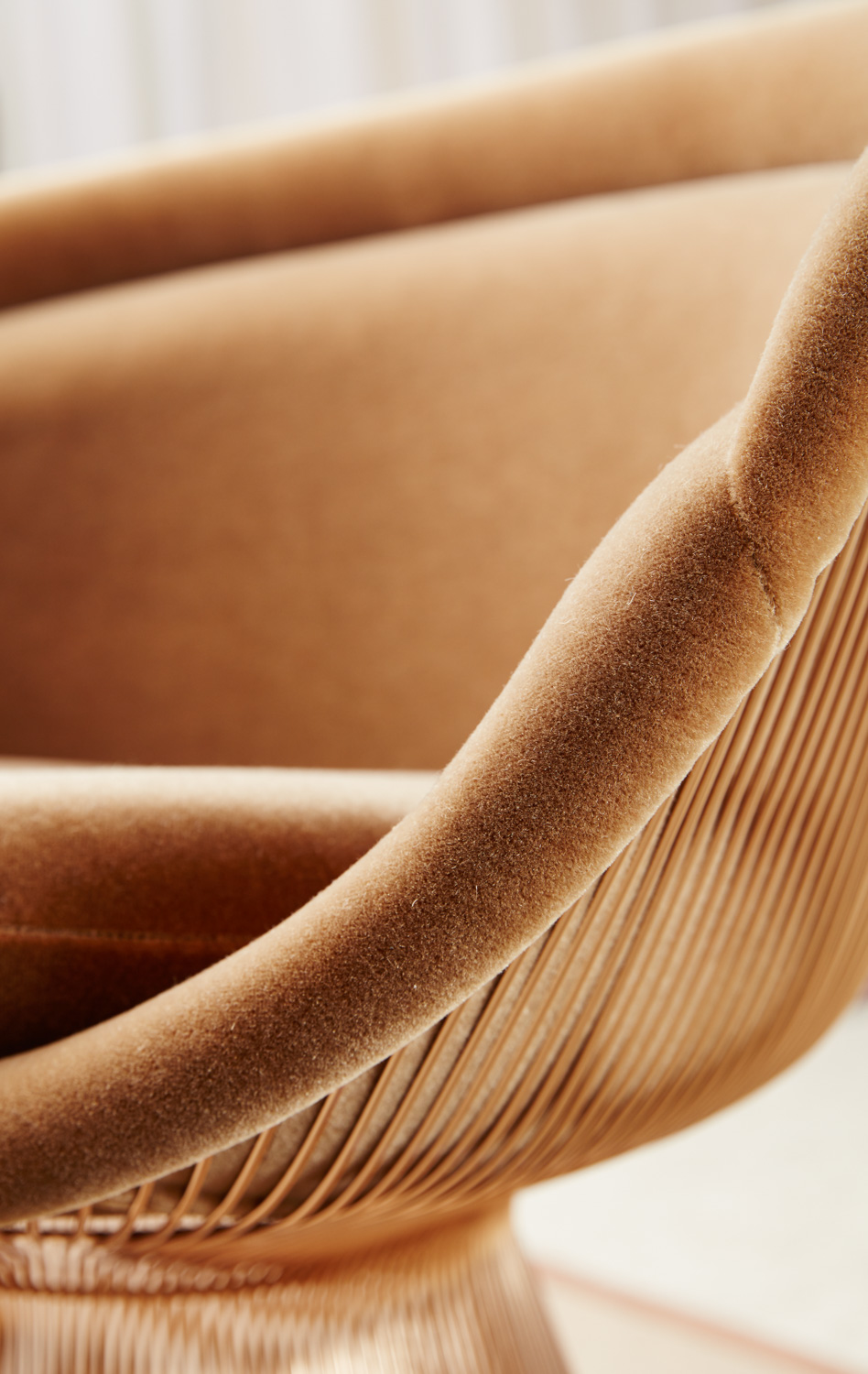 In 1966, the Platner Collection captured the “decorative, gentle, graceful” shapes that were beginning to infiltrate the modern vocabulary. The iconic pieces are created by welding hundreds of curved steel rods to circular frames, simultaneously serving as structure and ornament.