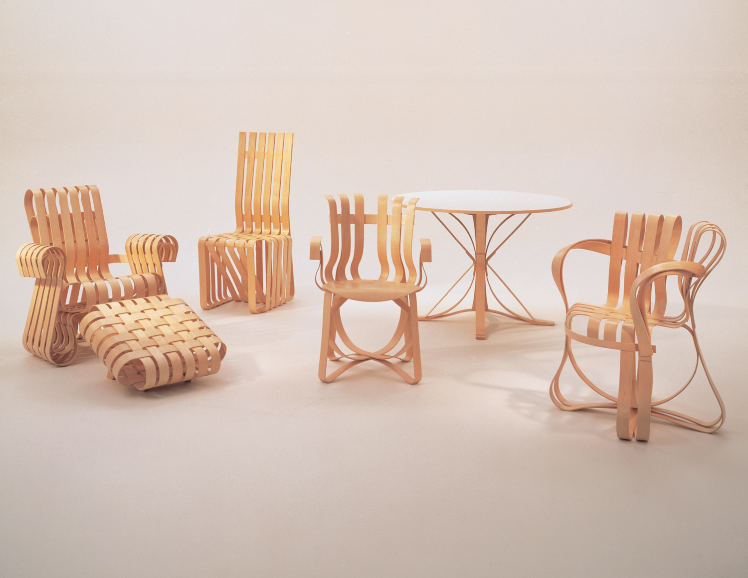 Inspired by the surprising strength of the apple crates he had played on as a child, Frank Gehry created this thoroughly original collection of bentwood chair and table designs. Gehry’s architecture draws its strength from the sculptural approach with which he has expanded the vocabulary of buildings. Bringing this same approach to furniture, Gehry constructed the entire collection with interwoven strips of maple. The ribbon-like designs transcend the conventions of style by focusing, as the great modernists did, on the essential challenge of deriving form from function.