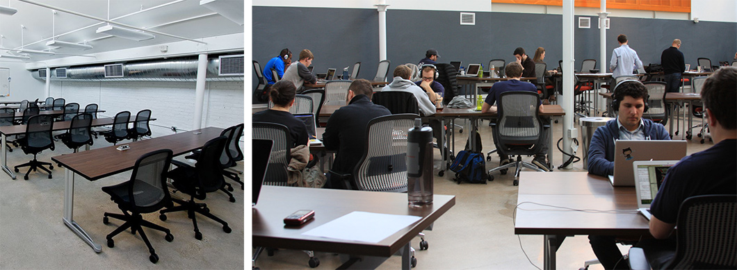 The gSchool’s two large classrooms feature easily reconfigurable furniture and ample power and data for the up-and-coming computer programmers; The main floor Atrium, furnished with “hot desks” for beginning entrepreneurs, can easily transform into an event space
