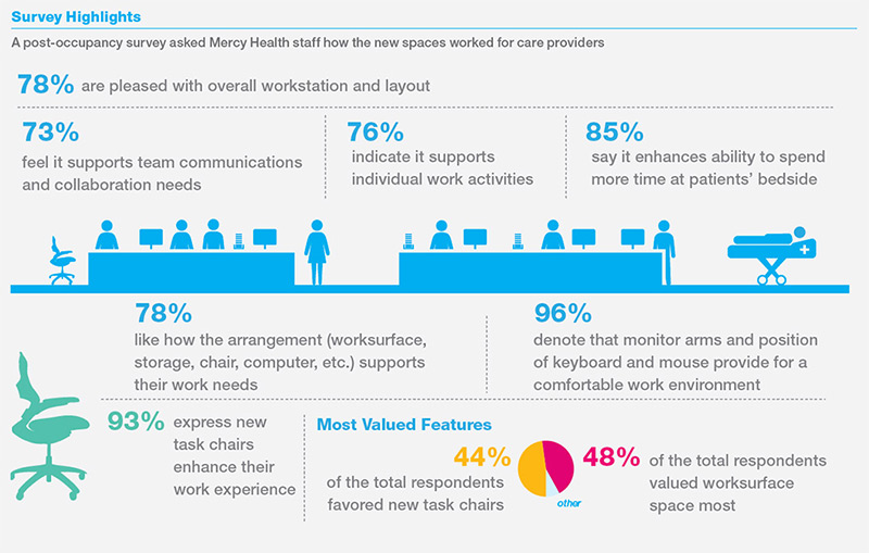 Easily adjusted elements won raves as well. “The monitor arms can be used sitting or standing on either side of the station,” said Mercy Health’s Stephens. “They can be raised, lowered and swiveled easily to accommodate different people. It’s a really well-appreciated design treatment,” he said. Indeed. A post-occupancy survey revealed that 96% of users felt ergonomic elements including monitor arms and position of keyboard and mouse added to their comfort while working on the computer.