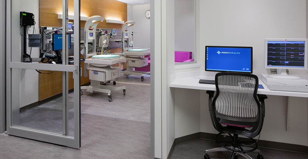 Mercy Health’s new approach to providing care called for electronic record-keeping, necessitating a computer in each patient room, as well as workstations outside of every two rooms and in team workspaces.