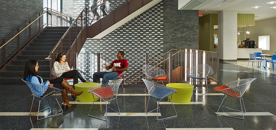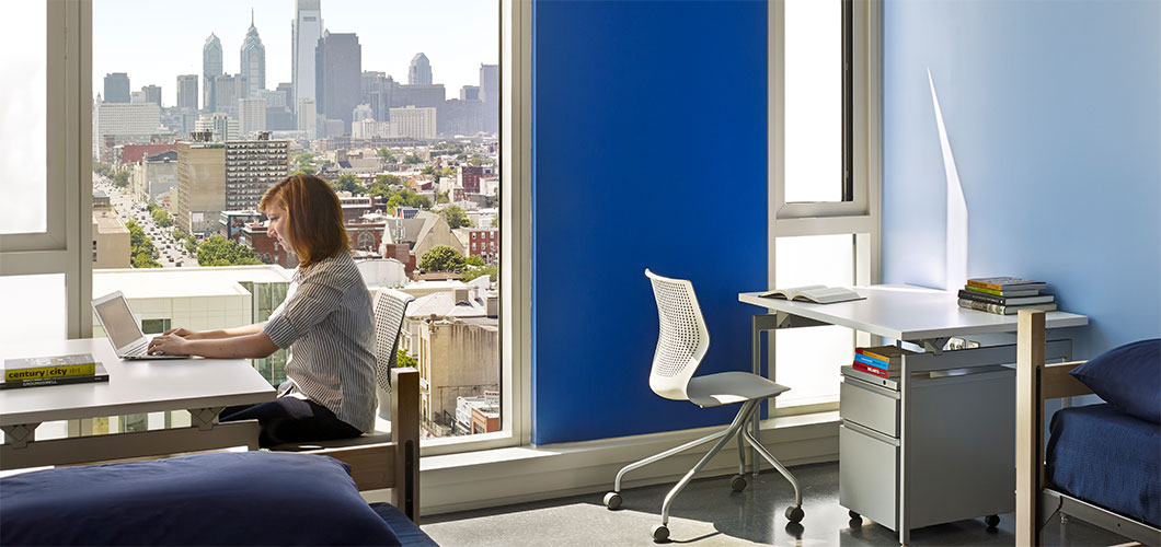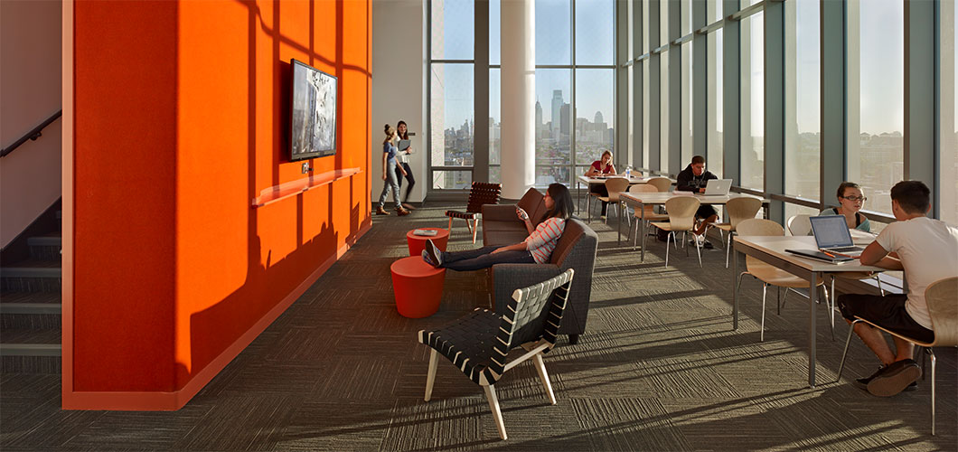 The Mitchell and Hilarie Morgan Residence Hall and Dining Complex at Temple University opened in the Fall of 2013. The 33-story-structure includes two residence buildings, a dining hall and a 30,000 square-foot terrace. Morgan Hall is designed to inspire learning and collaboration and to connect students to the surrounding Philadelphia area.